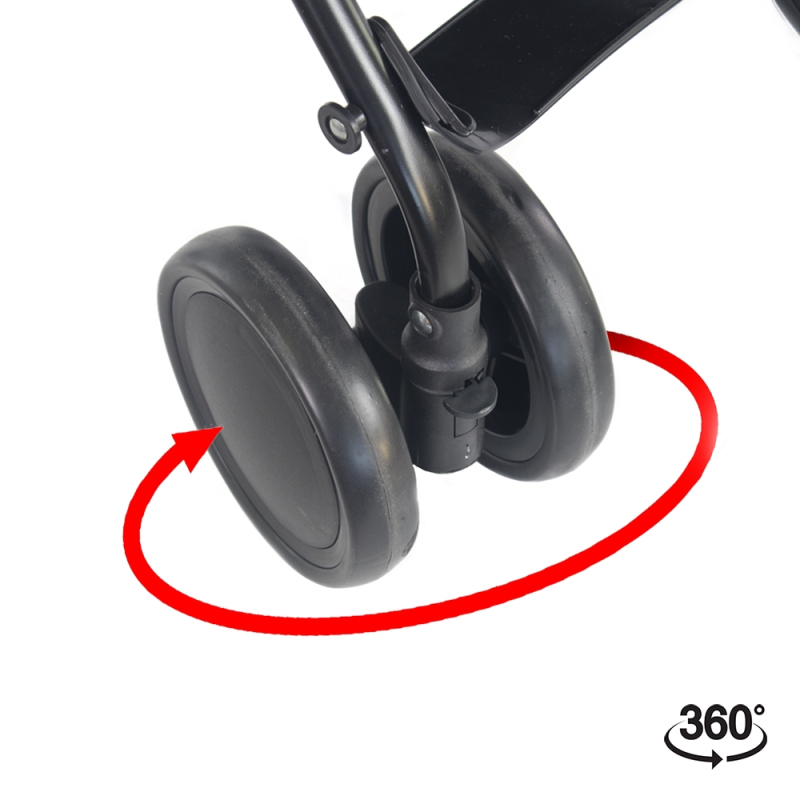 ZDEJMOWANE KOŁA: koła wózka składanego Elefant można łatwo zdemontować, wystarczy nacisnąć przycisk, aby je zdjąć, co ułatwi przechowywanie krzesełka. Ponadto przednie koła tego wózka mają obrót o 360º, dzięki czemu można wykonywać lekkie ruchy, a także system zapobiegający obracaniu się, który blokuje je, gdy jest to wygodniejsze. Dodatkowo jego tylne koła posiadają hamulec blokujący oraz niezależny pedał hamulca na każdym kole, aby móc je w każdej chwili zablokować i uniknąć ewentualnych wypadków.