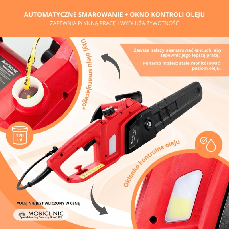 WYDAJNOŚĆ: Posiada automatyczny system smarowania łańcucha, gwarantujący optymalną wydajność i przedłużający żywotność narzędzia. To, w połączeniu z łatwym dostępem do zbiornika oleju , sprawia, że konserwacja jest szybka i łatwa. Posiada okienko umożliwiające podgląd poziomu oleju. Nie zawiera oleju. Rodzaj oleju stosowanego w pile łańcuchowej to SAE 20 lub SAE 30.