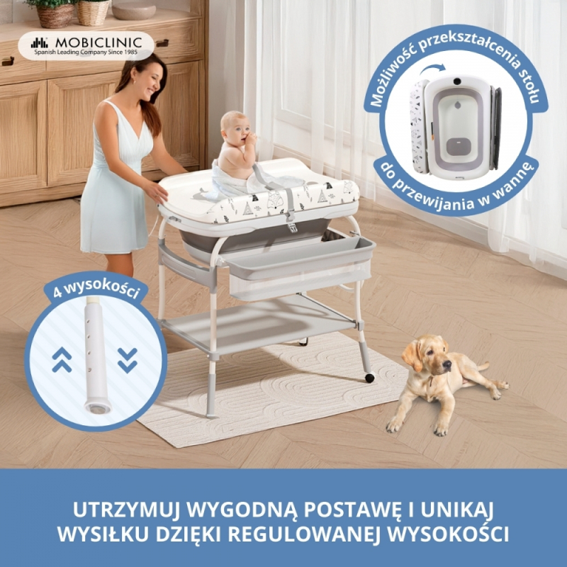 KOMFORT I ERGONOMIA: Regulacja wysokości w czterech pozycjach (86, 89, 92 i 95 cm) pozwala dostosować przewijak do potrzeb rodziców, odciążając plecy podczas kąpieli lub przewijania dziecka, zapewniając wygodniejszy doświadczenie.