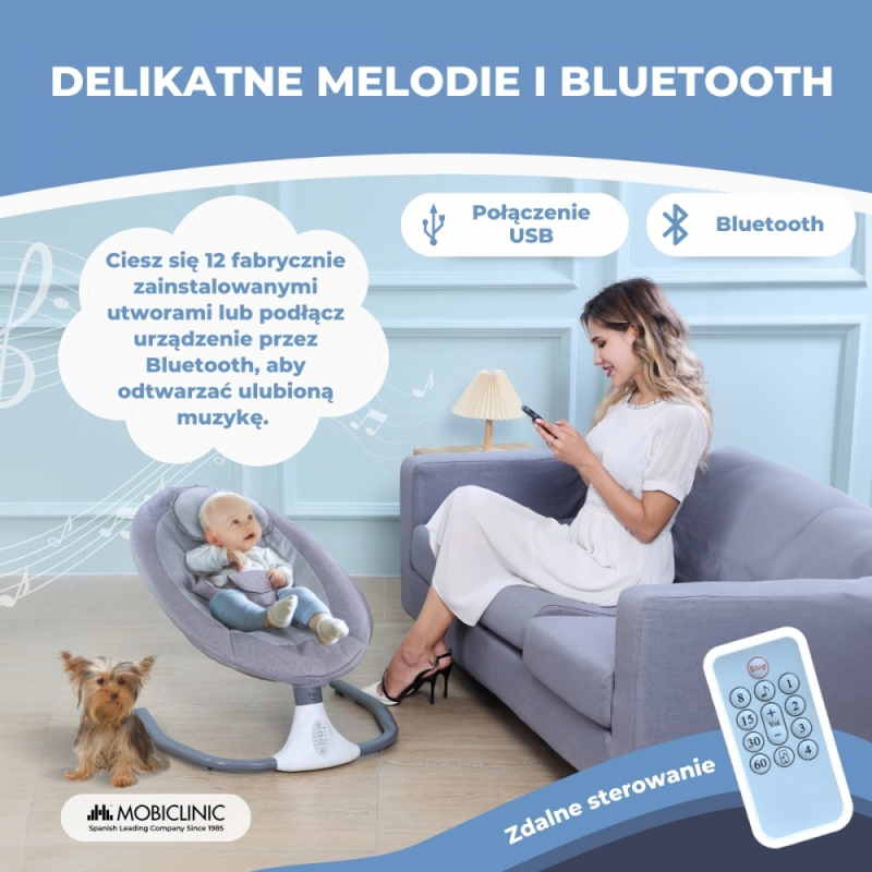 FUNKCJE DODATKOWE: W zestawie pilot umożliwiający łatwą regulację ustawień oraz timer umożliwiający kontrolę czasu bujania.