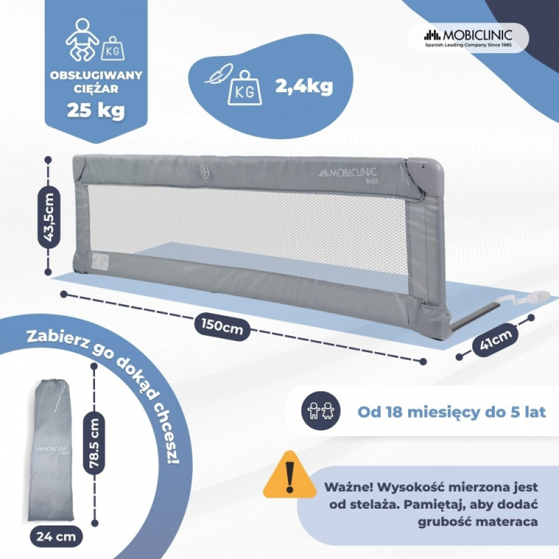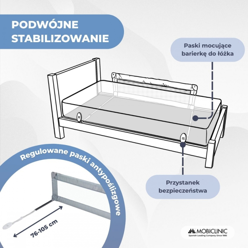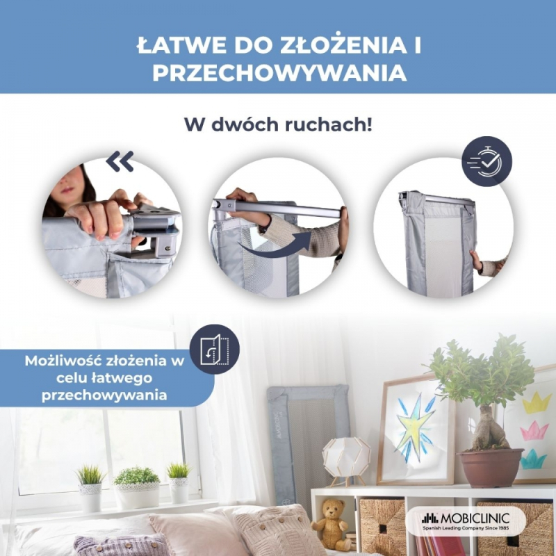 Składana barierka do łóżka | Składana | Przenośny | Podwójne mocowanie | 150cm | Max. waga 25kg | Dreamy | Mobiclinic