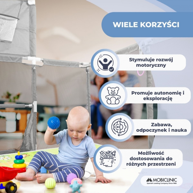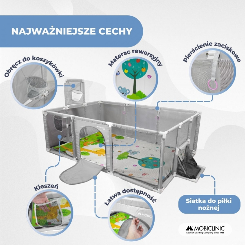 Dzięki wymiarom 128 x 233 cm oferuje przestronną i wygodną strefę do zabawy, gdzie maluchy mogą bezpiecznie raczkować, wstawać, bawić się lub ćwiczyć pierwsze kroki. Dołączona mata zapewnia również miękką powierzchnię, która izoluje podłogę i poprawia komfort zabawy lub odpoczynku.