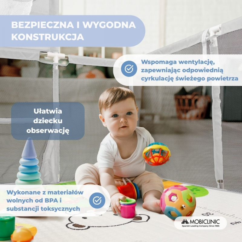 Aby zachęcić maluchy do samodzielności i koordynacji, kojec wyposażony jest w cztery pierścienie bezpieczeństwa, które pomagają im stopniowo i bezpiecznie uczyć się wstawania. Przewiewne ścianki z siatki pozwalają rodzicom na stałą obserwację dziecka i zapewniają stałą wentylację.