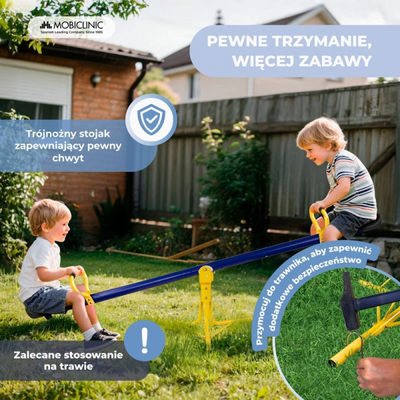 Huśtawka Mobifun została zaprojektowana z myślą o jednoczesnej zabawie dwójki dzieci, co zachęca do interakcji, współpracy i rozwoju umiejętności społecznych od najmłodszych lat. Wygodne i ergonomiczne siedziska zapewniają wygodną pozycję podczas zabawy.