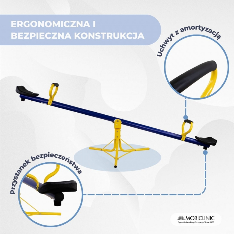 Dzięki funkcji obrotu o 360 stopni maluchy mogą huśtać się we wszystkich kierunkach, rozwijając równowagę i koordynację. Wygodna konstrukcja z antypoślizgowymi uchwytami pokrytymi pianką chroni dłonie i zapewnia pewny chwyt. Dla dodatkowego bezpieczeństwa, hak uziemiający wzmacnia stabilność, gwarantując bezpieczną zabawę zarówno w domu, jak i na zewnątrz.
