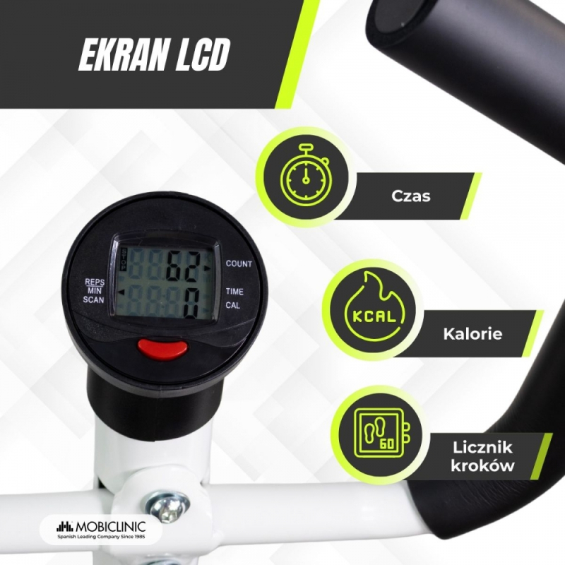 Dzięki ruchomym ramionom oferuje kompletny trening, który poprawia koordynację i wytrzymałość, pomagając jednocześnie spalać kalorie. Jego ergonomiczna konstrukcja zapewnia płynny ruch, minimalizując wpływ na stawy. Posiada ekran LCD, który automatycznie wyświetla następujące wartości: czas treningu, szacowane kalorie, skumulowane kroki i kroki na minutę. Posiada automatyczne wyłączanie po 4 sekundach bezczynności i funkcję automatycznego skanowania, która zmienia informacje co 4 sekundy.