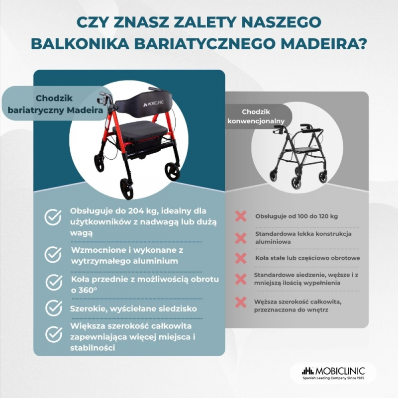 Chodzik bariatryczny Madeira Mobiclinic został zaprojektowany z myślą o zapewnieniu maksymalnej stabilności, wytrzymałości i komfortu . Dzięki udźwigowi do 204 kg , znacznie przewyższa standardowe modele (100-120 kg), co czyni go idealnym rozwiązaniem dla osób z nadwagą lub poszukujących większego bezpieczeństwa podczas poruszania się.