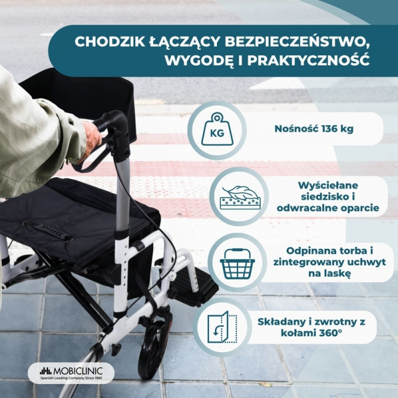 Dodatkowo w zestawie znajduje się odpinana torba na zakupy wykonana z trwałego materiału Oxford, idealna do noszenia różnych rzeczy, a także uchwyt na laskę, dzięki któremu codzienne czynności stają się jeszcze łatwiejsze.
