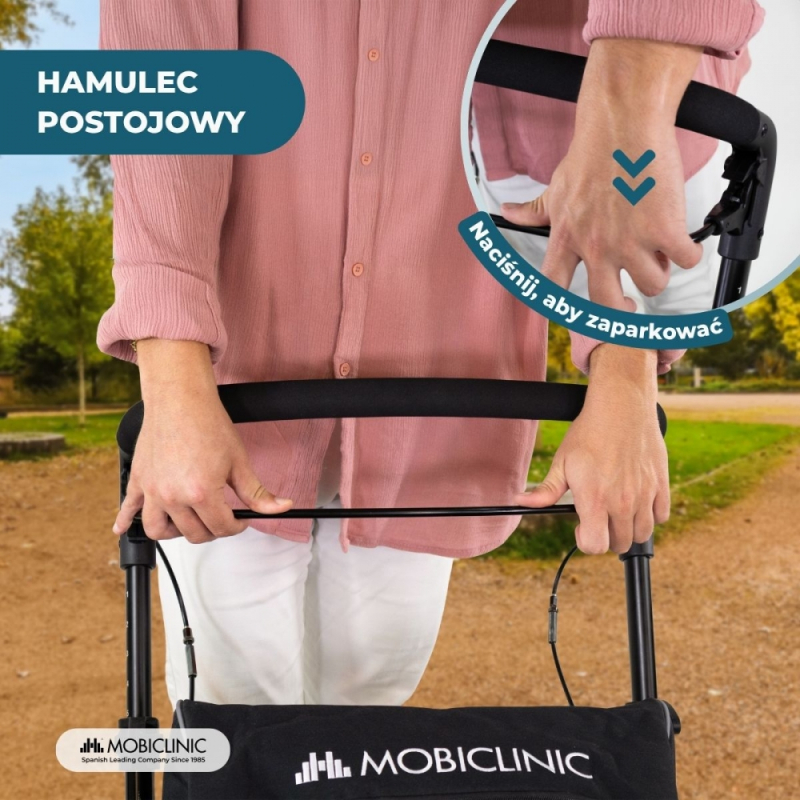 BEZPIECZNY HAMULEC POSTOJOWY : Hamulec blokuje chodzik w razie potrzeby, zapewniając dodatkową stabilność i zapobiegając niezamierzonemu ruchowi podczas codziennego użytkowania w domu lub w podróży. Aby całkowicie zatrzymać chodzik, naciśnij hamulec, aż zatrzaśnie się na swoim miejscu.