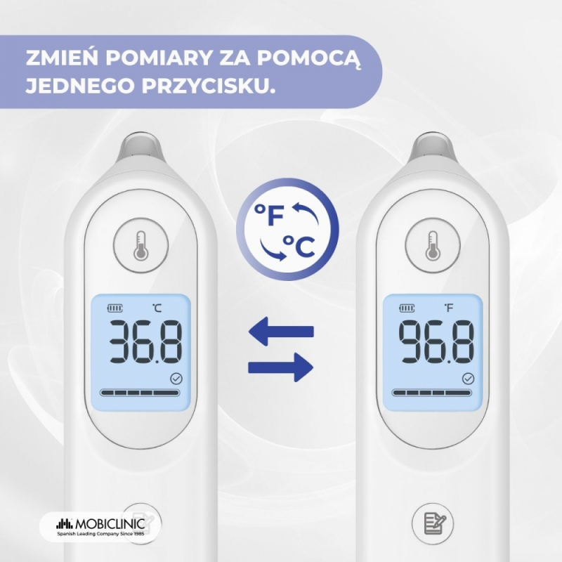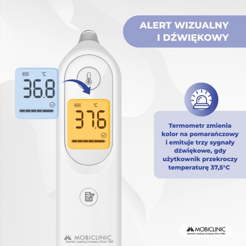 Termometr douszny | Pamięć | Alarm gorączki | Automatyczne wyłączanie | Wyświetlacz | ºC i ºF | Thermobi | Mobiclinic