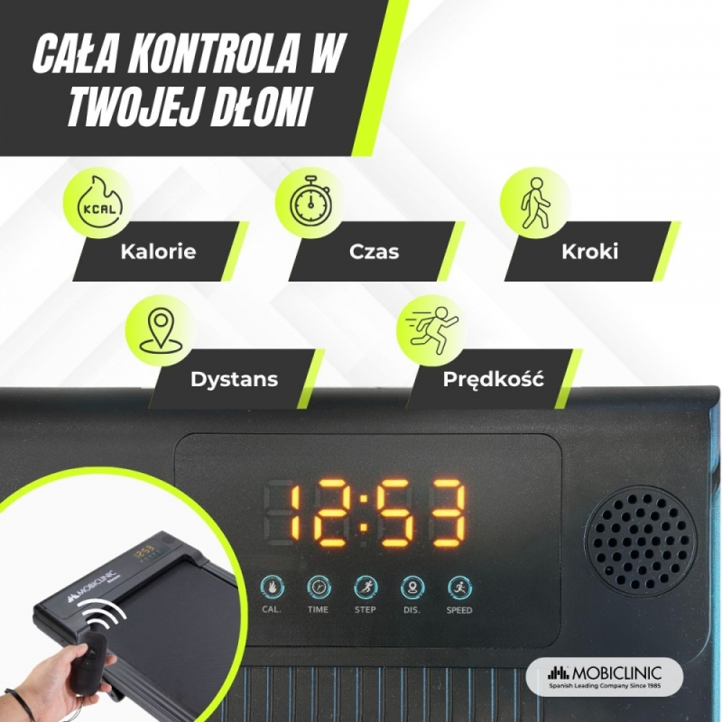 STEROWANIE REMOTO: Bieżnia jest wyposażona w pilota, który umożliwia zwiększanie lub zmniejszanie prędkości, a także natychmiastowe zatrzymanie urządzenia.
