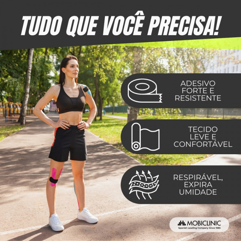 Além disso, as fitas kinésio são suaves e oferecem o máximo conforto para se adaptarem à pele O kinésio tape é ótimo para desportistas por causa das diferentes metodologias de aplicação e mobilidade completa. Pode utilizar-se durante vários dias e oferece soluções preventivas e melhora do desempenho desportivo