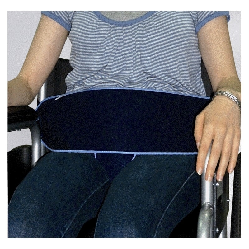 A sua colocação é muito simples: basta colocar o cinto no abdómen e rodear a cintura com ele, fixando-o atrás das costas da cadeira. Finalmente, coloque a cinta perineal entre as pernas e prenda-a à parte de trás da cinta. Este cinto permite ao utilizador total liberdade de movimento nas extremidades superiores e no peito.