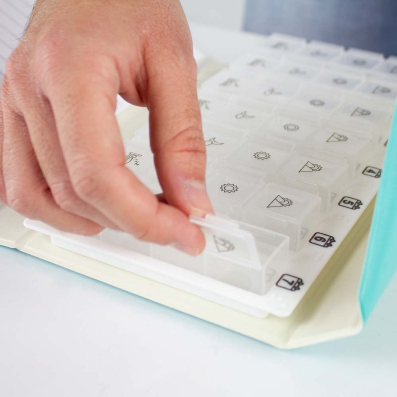 FÁCIL DE TRANSPORTAR: se é uma pessoa que necessita de se deslocar constantemente, graças à carteira integrada pode levar sempre consigo a sua caixa de comprimidos semanal