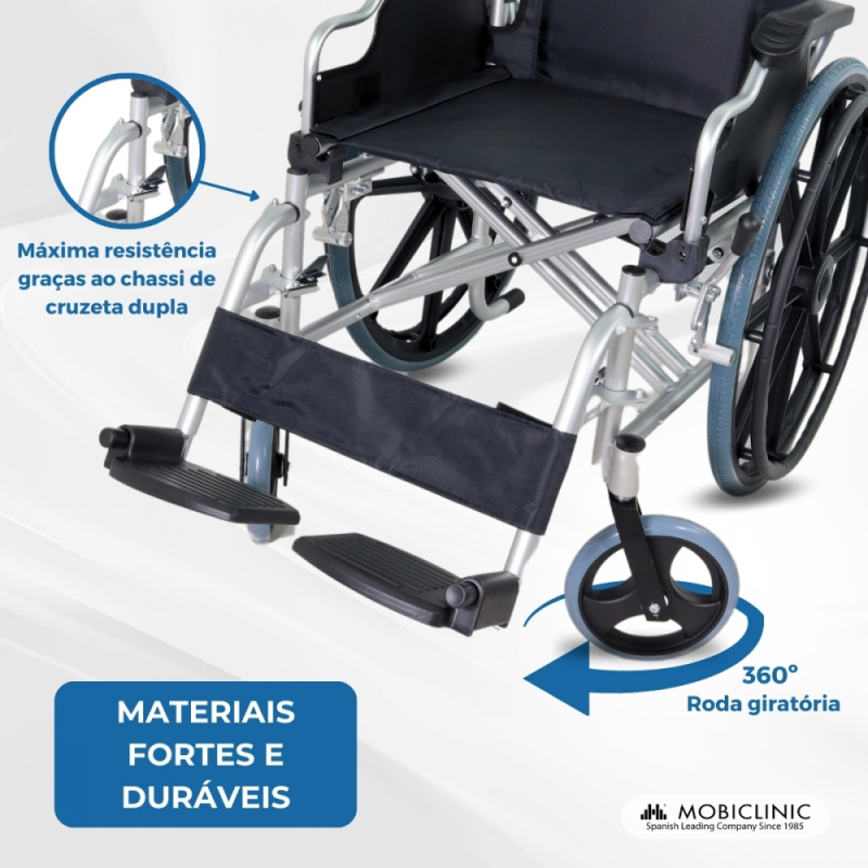 Esta cadeira de rodas para idosos é fabricada em alumínio leve de alta resistência, que proporciona grande resistência e leveza.