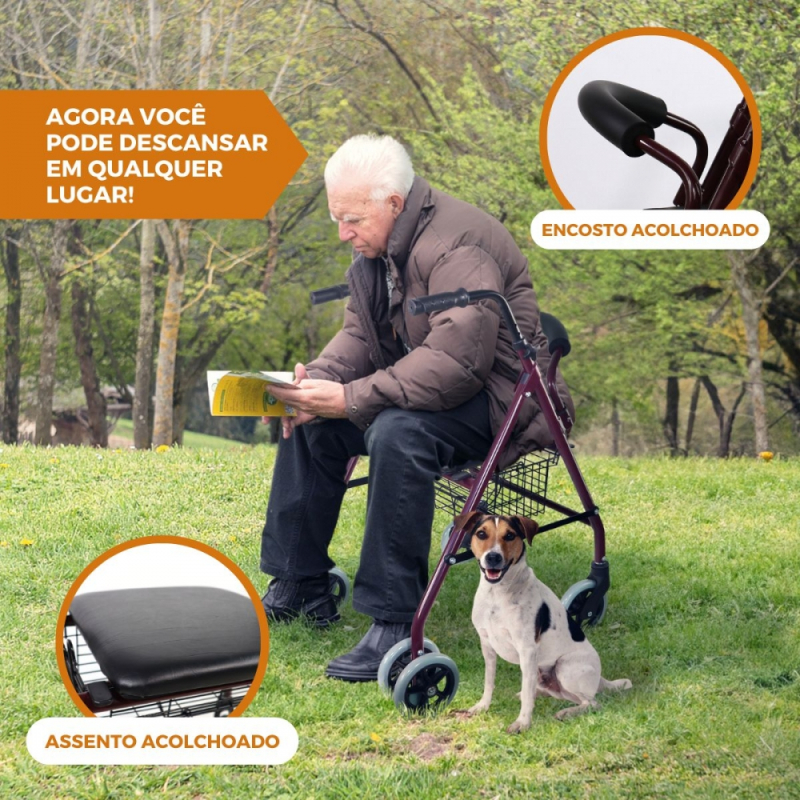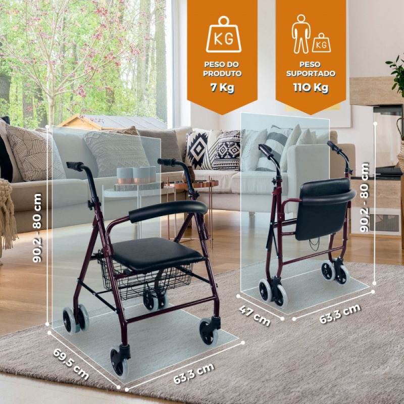 Andarilho | Para idoso | Dobrável | Alumínio | Assento e encosto | Bordô | Paterna | Clinicalfy