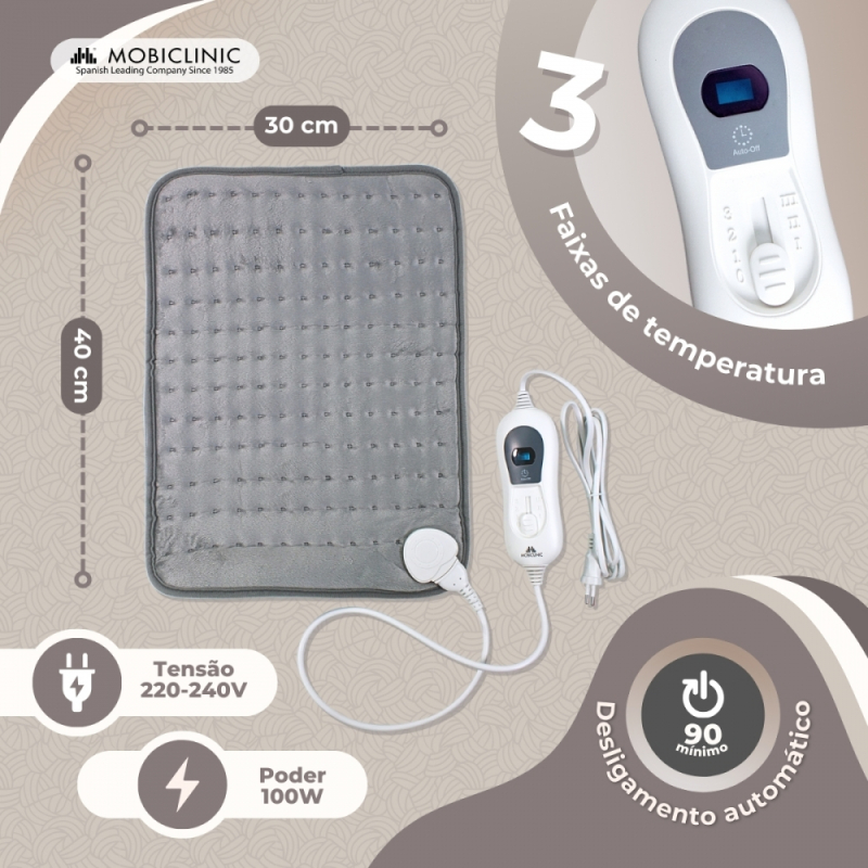 Almofada aquecimento elétrico | 40x30cm | 3 níveis calor | Consumo baixo | Custo mínimo | Desligamento automático | Mobiclinic