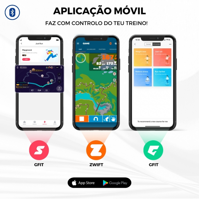 Além disso, esta passadeira elétrica contém um visor LED Bluetooth que lhe permite ligar o seu telemóvel e acompanhar o seu exercício, bem como poder ligá-lo a aplicações tais como Gfit, Zwift e SPAX. A aplicação Zwift está disponível em inglês, francês, italiano, alemão, espanhol, chinês e japonês, enquanto as outras duas estão disponíveis apenas em inglês.