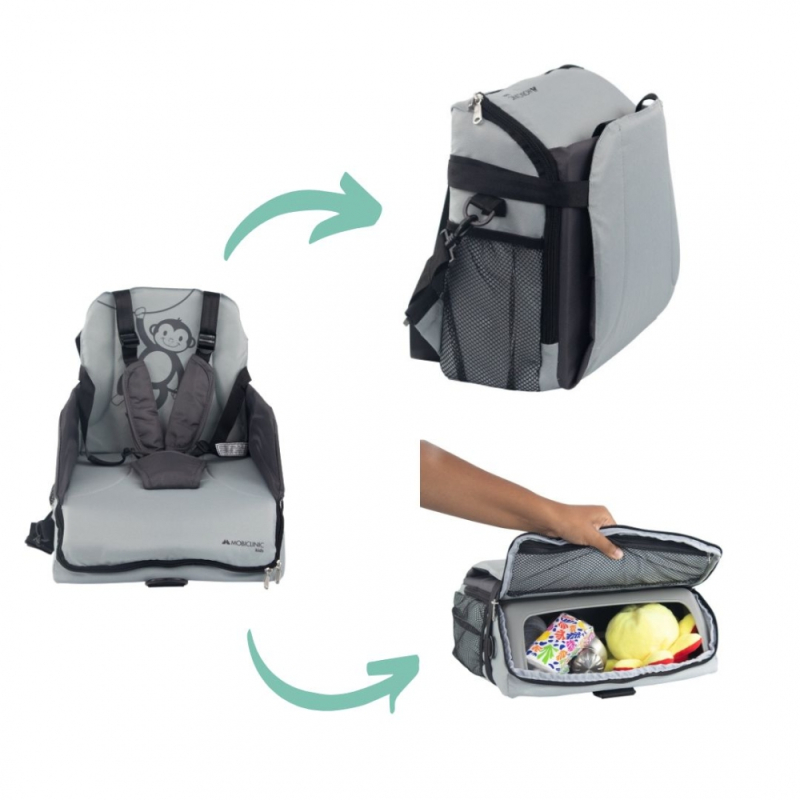 - Cadeira alta para viagens: é portátil e dobrável. Tem um compartimento para guardar biberões, fraldas, etc.