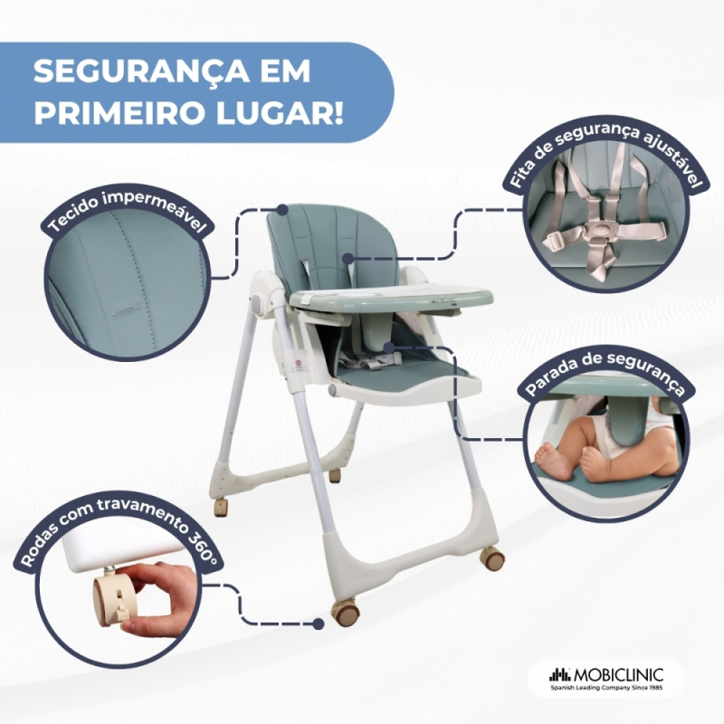 Cadeira alta com rodas | Evolutiva | Regulável em altura | Dobrável | Tabuleiro amovível | Verde | Simba | Mobiclinic