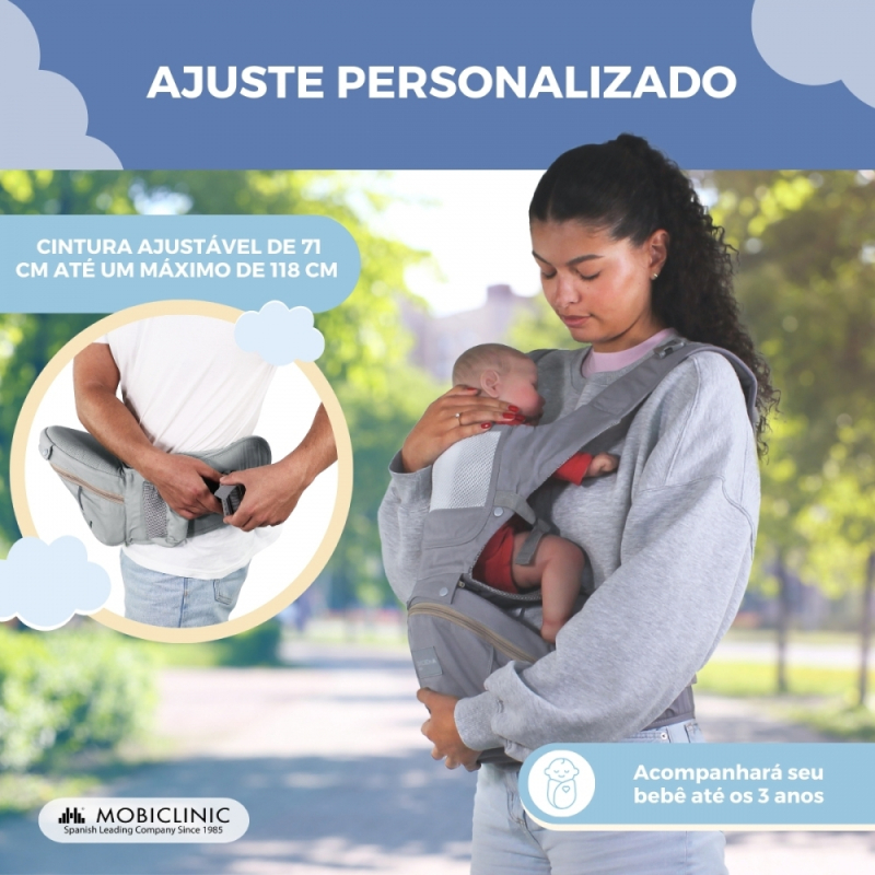 POSIÇÃO ERGONÔMICA M: O porta-bebês promove a postura ergonômica do bebê, permitindo que ele adote a posição natural de cócoras . Quando o bebé está sentado, a mochila proporciona uma posição favorável em forma de M, ideal para o desenvolvimento e conforto do pequeno, garantindo um apoio adequado para as costas e ancas.