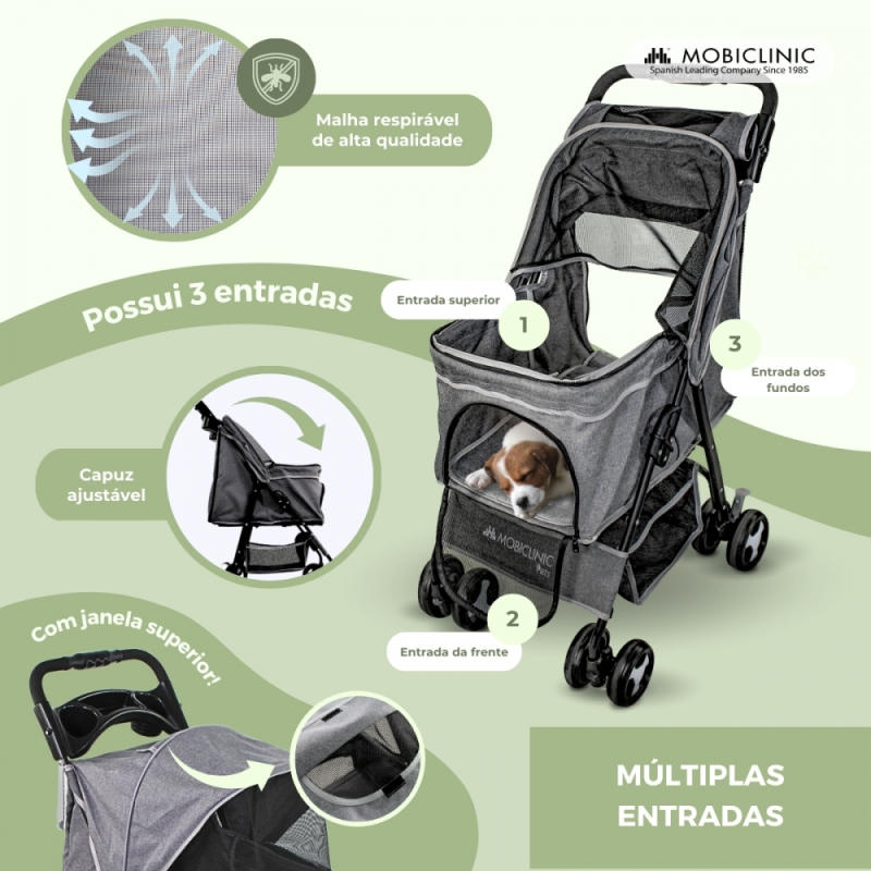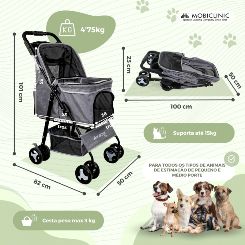 Carrinho para cães | Dobrável |Rodas freio e 360º |3 acessos |Com toldo| Cesto armazenamento e porta-copos |Cinzento| Mobiclinic