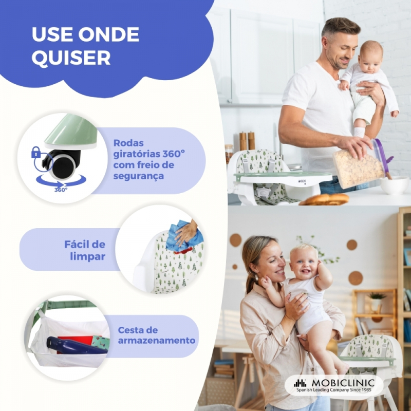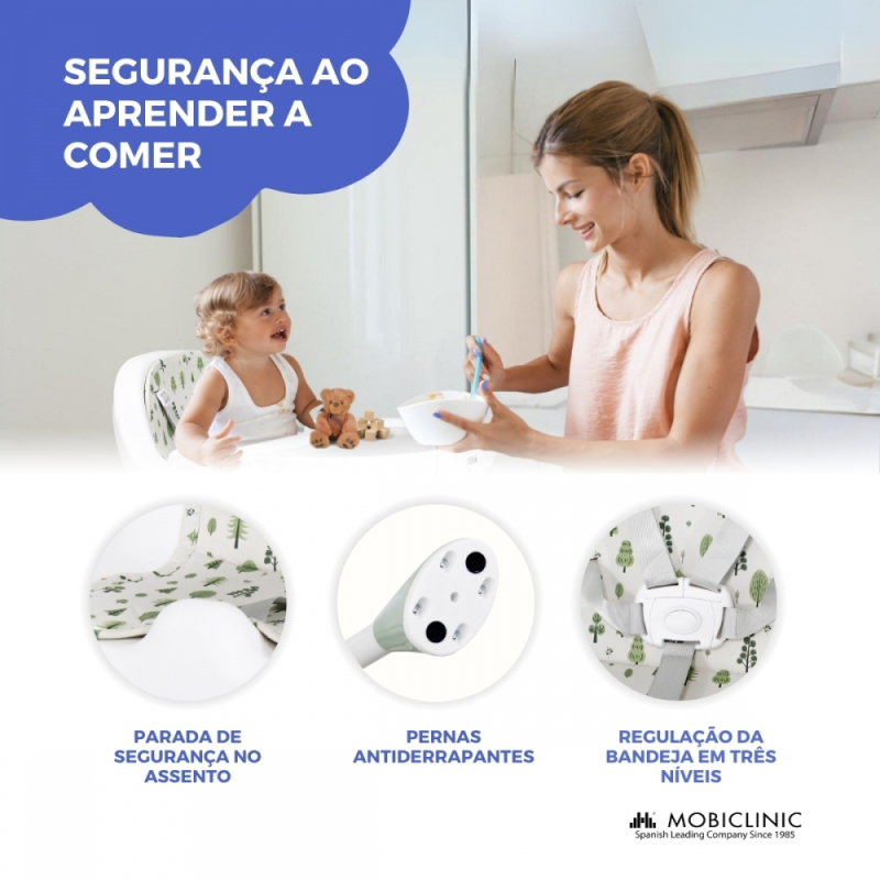 FÁCIL DE LIMPAR E DURÁVEL: É muito fácil manter a cadeira limpa devido aos materiais de que é feita. É necessário apenas um pano úmido. Além disso, possui alta durabilidade e é à prova d’água . Por todos estes motivos, a cadeira alta Forest é uma opção perfeita para os pais que procuram um investimento a longo prazo e pretendem manter a sua higiene sem complicações.