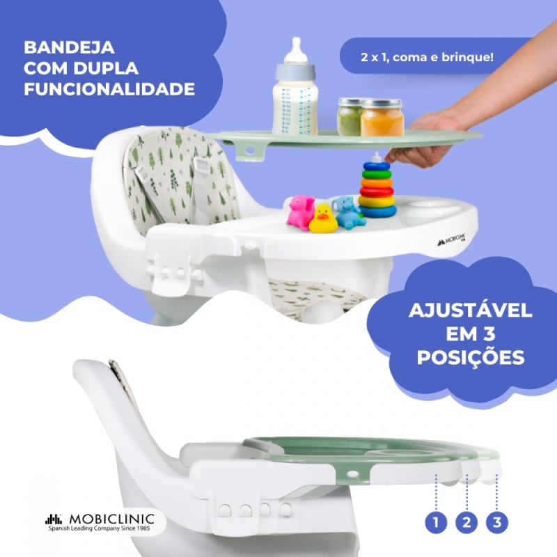 COM BANDEJA AJUSTÁVEL EM 3 NÍVEIS: Desta forma, a cadeira alta Forest é muito prática , pois proporciona espaço para a movimentação do pequeno dependendo da atividade que realiza. A bandeja é removível e dupla.