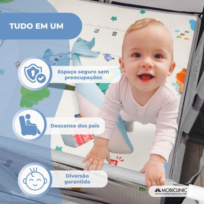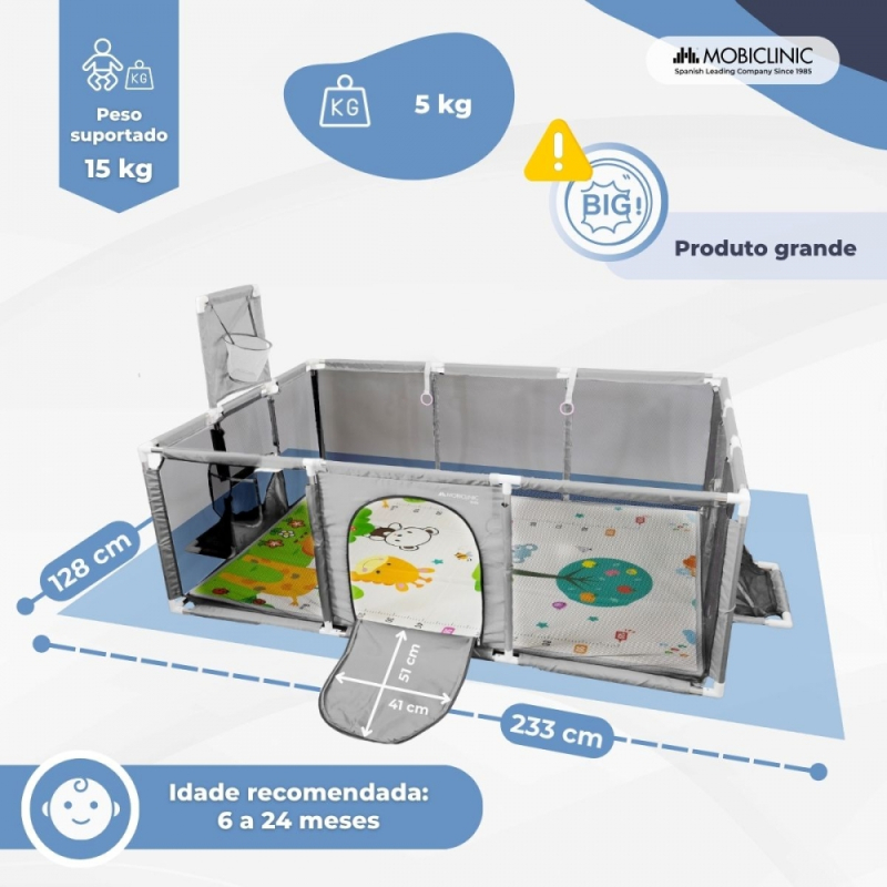 Graças às suas dimensões de 128 x 233 cm, oferece uma área de recreação espaçosa e confortável, onde os pequenos podem engatinhar, ficar de pé, brincar ou praticar os primeiros passos com segurança. O tapete incluso também oferece uma superfície acolchoada que isola o piso e aprimora a experiência de brincar ou descansar.