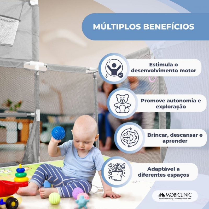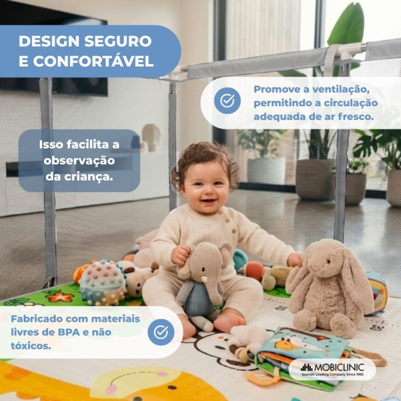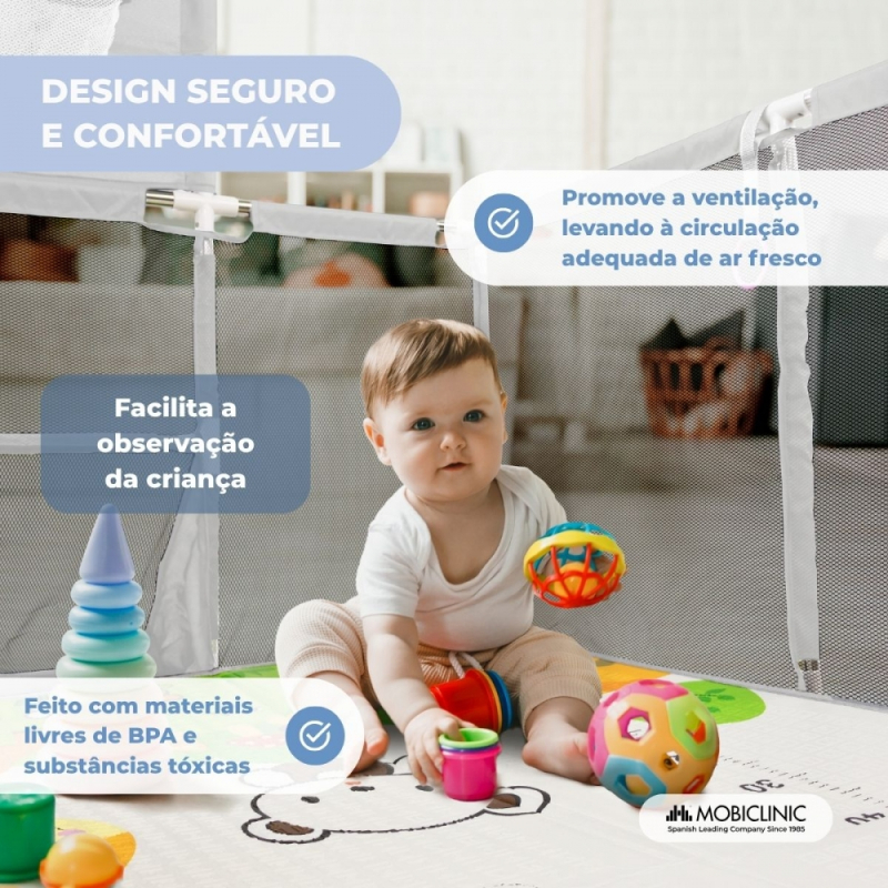 Para incentivar a independência e a coordenação dos pequenos, o cercadinho possui quatro argolas de segurança projetadas para ajudá-los a aprender a ficar em pé de forma gradual e segura. Suas paredes de malha respirável permitem que os pais monitorem o bebê o tempo todo e também garantem ventilação constante.