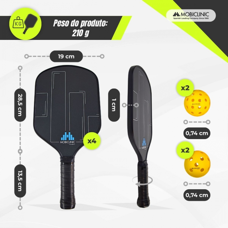 O conjunto Mobiall Pickleball é a escolha perfeita tanto para iniciantes quanto para jogadores experientes que buscam uma atividade física completa e divertida. Inclui quatro raquetes feitas de fibra de vidro com núcleo de polímero em formato de colmeia, um material que oferece uma combinação de controle e potência durante o jogo. Suas alças ergonômicas com empunhadura antiderrapante e absorvente garantem uma pegada confortável.