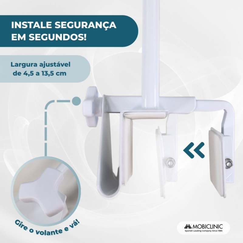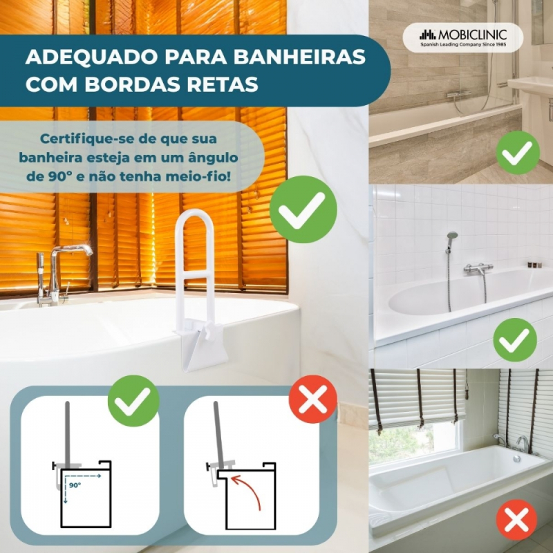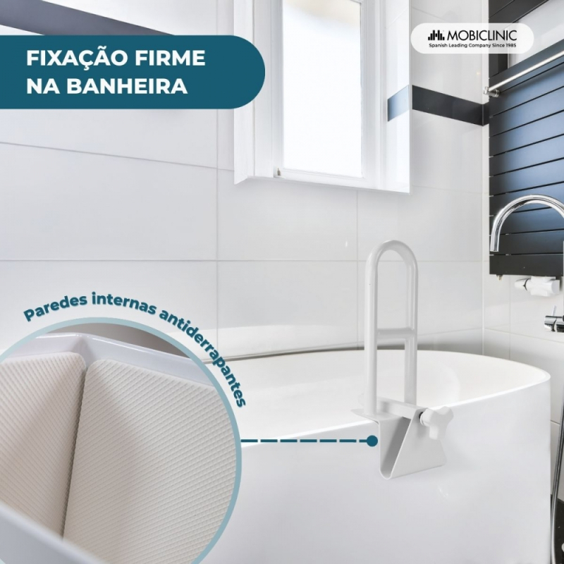 Adapta-se a banheiras com bordas lisas e planas, com largura mínima de 4,5 cm e máxima de 13,5 cm, adaptando-se a diferentes modelos de banheira. Sua alça ergonômica permite uma pegada firme e segura, mesmo com as mãos molhadas. Destaca-se principalmente por seu design robusto, capaz de suportar até 100 kg, sendo perfeita tanto para uso clínico quanto doméstico.