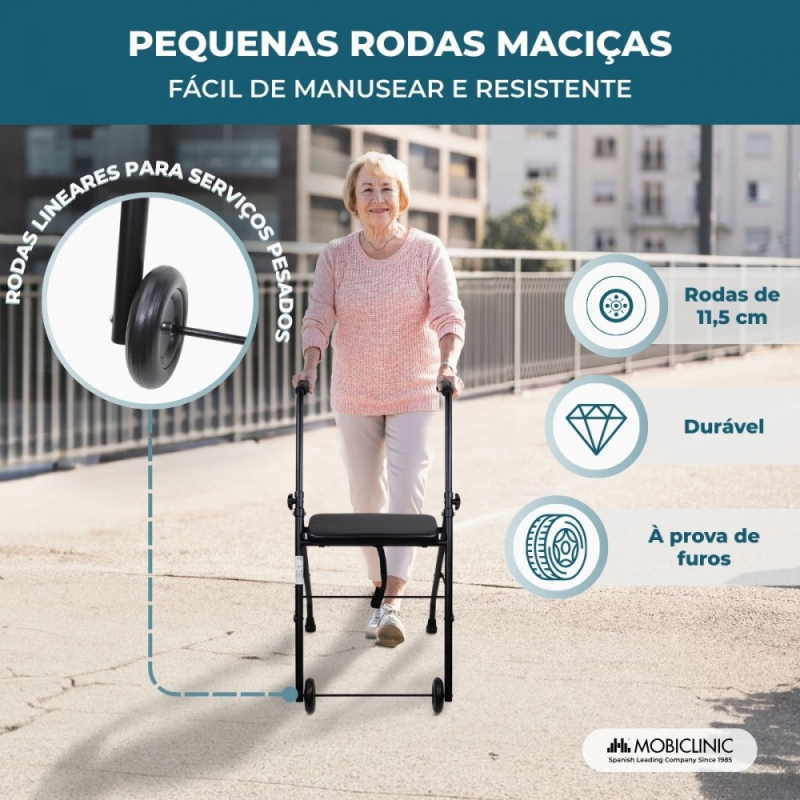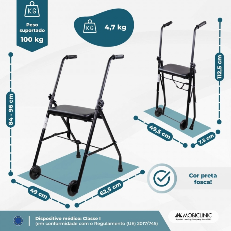 Andador para idosos | Dobrável | Assento | 2 rodas | Preto fosco | Emérita | Mobiclinic