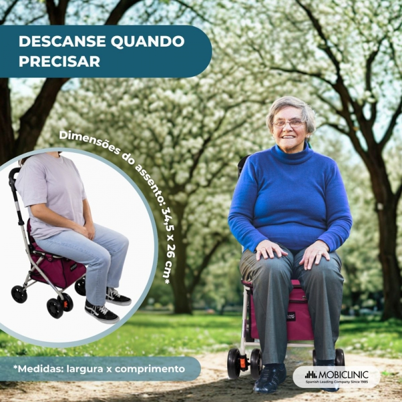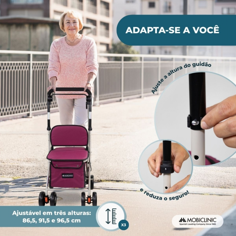 Este carrinho de compras também possui um assento confortável, resistente e acolchoado para que você possa descansar enquanto passeia ou espera em longas filas no mercado. Ele também possui um encosto para relaxamento das costas e uma sacola de compras removível, impermeável e lavável que suporta até 5 kg. O carrinho de compras Coliseo é um carrinho de alavanca única, permitindo que o usuário o utilize com uma mão, por exemplo, enquanto passeia com o neto ou o cachorro. Ele também possui altura ajustável , com três posições: 86,5 cm, 91,5 cm e 96,5 cm , permitindo que seja adaptado à altura do usuário e mantendo uma postura confortável e ergonômica durante o uso.
