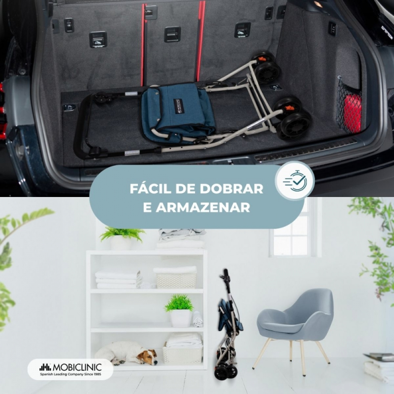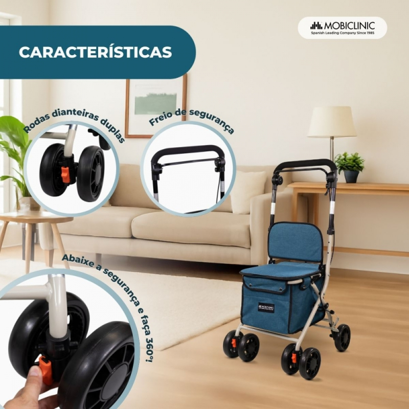 Carrinho de compras | 4 rodas | Até 120 kg | Dobrável | Com bolsa | Sistema de freio | Azul | Coliseu | Mobiclinic