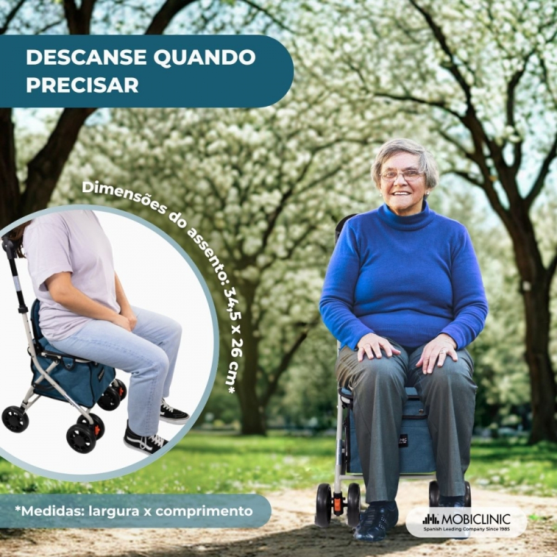 Este carrinho de compras também possui um assento confortável, resistente e acolchoado para que você possa descansar enquanto passeia ou espera em longas filas no mercado. Ele também possui um encosto para relaxamento das costas e uma sacola de compras removível, impermeável e lavável que suporta até 5 kg. O carrinho de compras Coliseo é um carrinho de alavanca única, permitindo que o usuário o utilize com uma mão, por exemplo, enquanto passeia com o neto ou o cachorro. Ele também possui altura ajustável , com três posições: 86,5 cm, 91,5 cm e 96,5 cm , permitindo que seja adaptado à altura do usuário e mantendo uma postura confortável e ergonômica durante o uso.