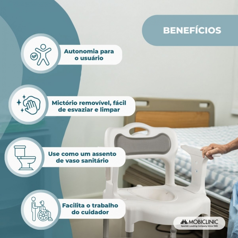 MICTÓRIO INCLUSO: Esta cadeira possui um mictório removível que suporta até 6 kg e tem capacidade para até 3500 ml, proporcionando grande autonomia ao usuário. A remoção do mictório é muito fácil, facilitando a limpeza e mantendo a cadeira sempre higiênica para o uso.