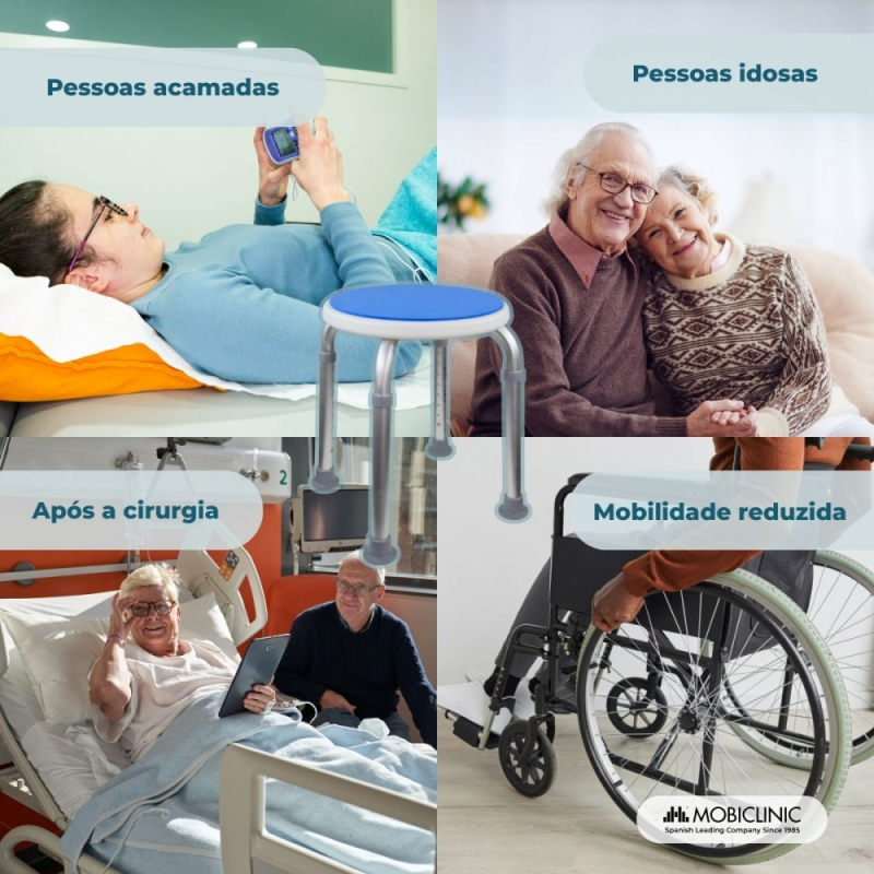 Banqueta para banheiro | Altura ajustável | Máx. 100 kg | Ponteiras e superfície em EVA antiderrapante | Foco | Mobiclinic