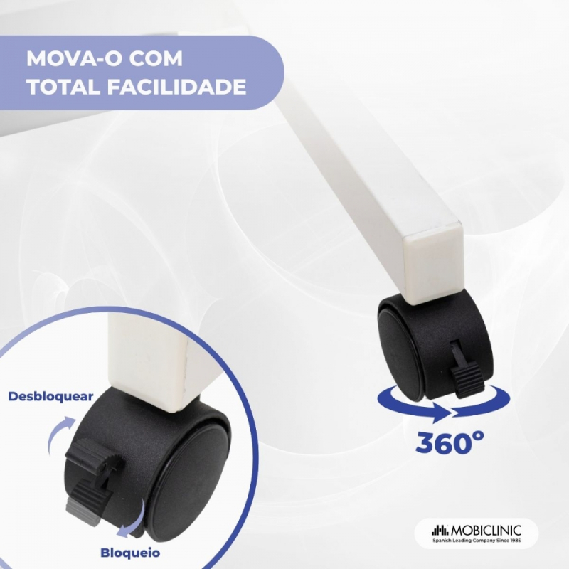 MOBILIDADE E ESTABILIDADE: Equipada com quatro rodízios giratórios multidirecionais, permite que a mesa seja movimentada sem esforço. Dois dos rodízios possuem freios que permitem o travamento seguro e evitam escorregões acidentais. Sua estrutura de aço oferece grande estabilidade e suporta até 15 kg de carga sobre o tampo da mesa.