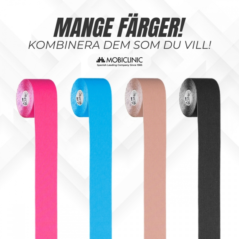 Denna kinesiotape har en storlek av 5 cm bred x 5 m lång och finns i olika färger som svar på önskemål från terapeuter som försvarar fördelarna med färgterapi i denna typ av produkt.