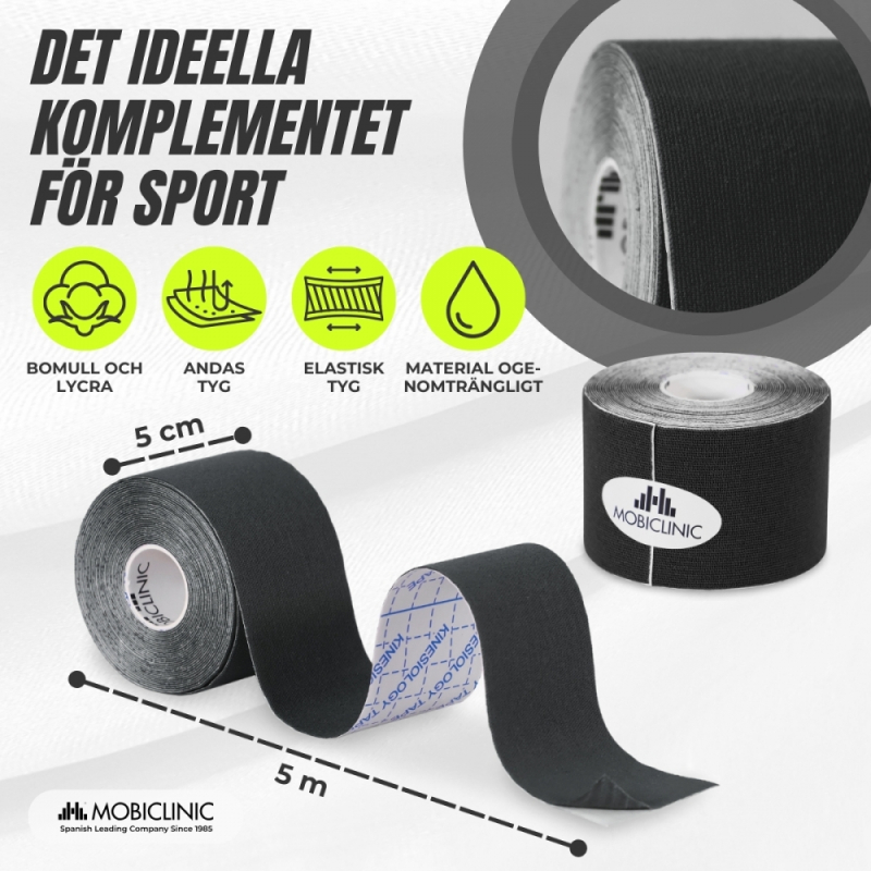 Skador som ankelvrickning, ödem, epikondylit eller plantar fasciit kan snabbt lindras med dessa kinesiologiska band som förbättrar sammandragningen av den försvagade muskeln.