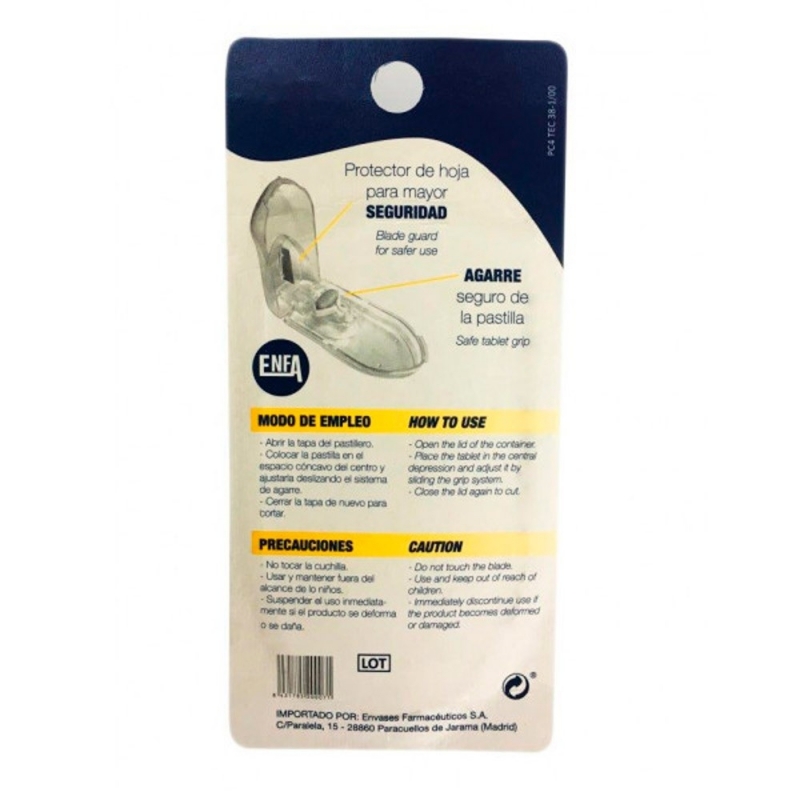 pillbox består av en genomskinlig plast område, utrustad med metallblad, som gör det möjligt att dela tabletten, och ett lagringsutrymme genomskinlig plast, som gör det möjligt att tydligt identifiera om det innehåller medicación.La lagringsutrymme har en kapacitet nog för att lagra minst 6/5 den genomsnittliga storleken tabletterna.