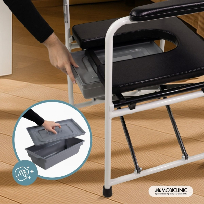 Den fällbara toalettstolen har också ett brett ryggstöd och säte för extrem komfort.