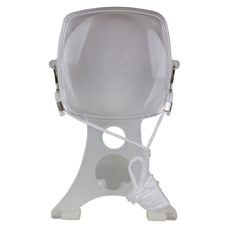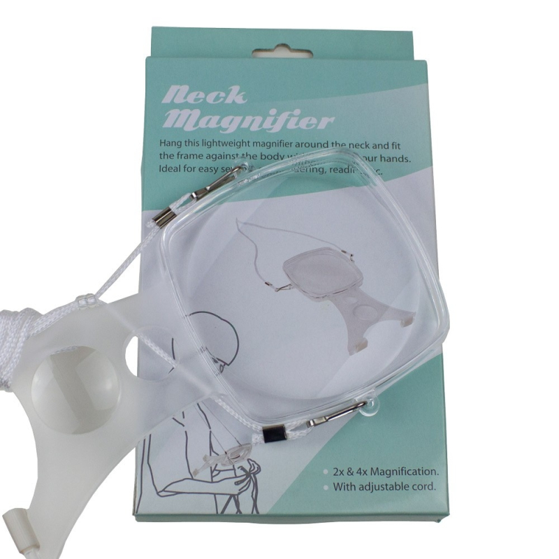 Förstoringsglas med lavalier utformat för att stödja den på kroppen och därmed undvika att behöva ta hennes händer. Detta möjliggör en mer bekväm läsning, särskilt för personer som har svårt gripande.
