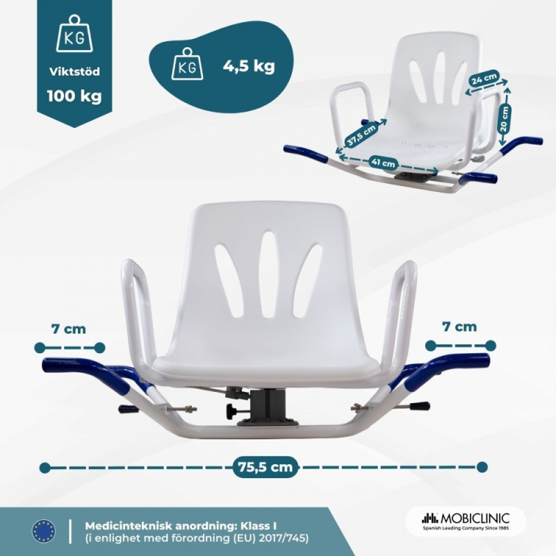 Den har en ergonomisk, vridbar sits som underlättar hygienen och gör vårdgivarens arbete enklare. Det är den perfekta möbeln för personer som inte kan stå upp under längre perioder på grund av cirkulationsproblem, ledsvaghet eller tillfälliga skador.