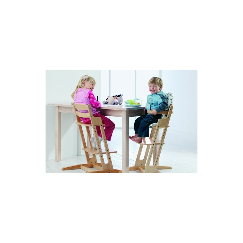 Den evolutionära barnstolen Danchair gör att barnet kan slå sig ner och utvecklas säkert efter sin tillväxt, eftersom den erbjuder en stor anpassningsförmåga. I själva verket kan sätet och bordsskivan fixeras på olika nivåer (14 olika positioner) genom att variera höjden på sätet och höjden mellan sätet och bordsskivan. Ryggstödet är försett med en träskena och en rem för att förhindra att barnet glider framåt.