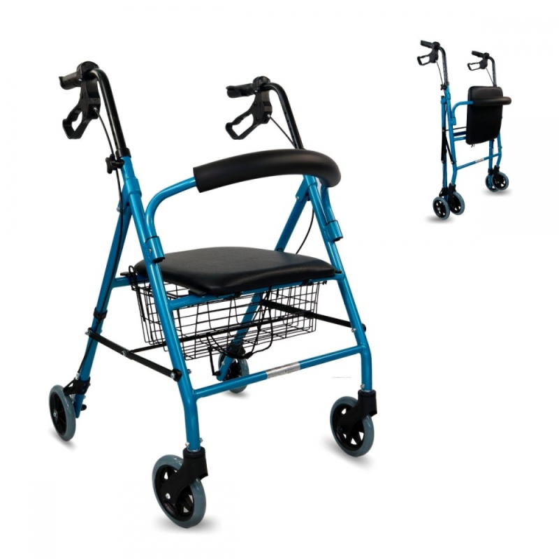 Denna rullator i aluminium har en vadderad sits och ryggstöd för att garantera komfort och säkerhet, samt tillräcklig vila efter ansträngning. Den innehåller en korg designad för att förvara dina tillhörigheter säkert och bekvämt medan du går. Du kan placera den både under sätet och framtill på rollatorn .
