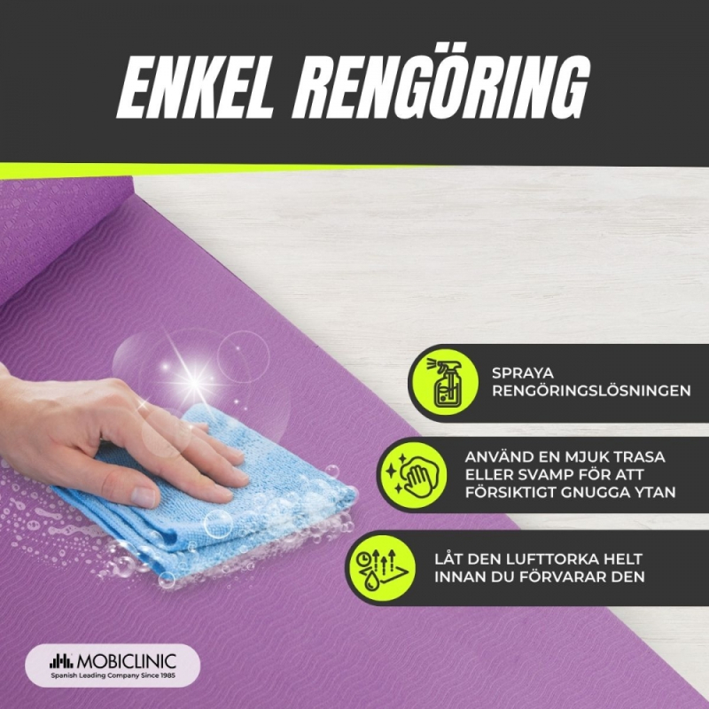 LÄTT ATT RENGÖRA: när träningen är klar är denna matta mycket lätt att tvätta, eftersom du helt enkelt måste rengöra den med en trasa med tvål och vatten, skölja den och till sist torka den med en torr trasa. På så sätt kan du behålla din matta som första dagen.