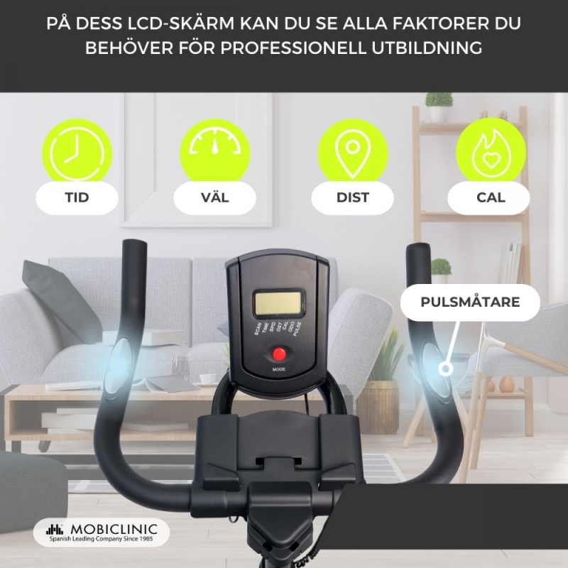 En av höjdpunkterna med den här cykeln är dess integrerade LCD-skärm, som ger dig feedback i realtid om din prestation. Du kan noggrant följa ditt träningspass genom att övervaka tid, hastighet, tillryggalagd sträcka, puls och förbrända kalorier. Med denna data kan du effektivt övervaka och justera dina träningsmål varje dag.