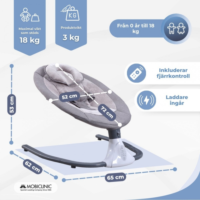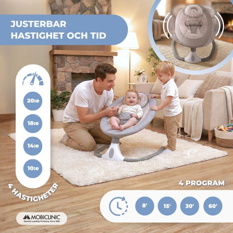 Praktiska funktioner för föräldrar: Babygungan har en fjärrkontroll som gör det enkelt att justera inställningarna utan att behöva gå upp. Föräldrar kan fjärrstyra gunghastigheten, spela musik eller aktivera timern, vilket är särskilt användbart när barnet redan sover eller när föräldrarna är upptagna med andra uppgifter.